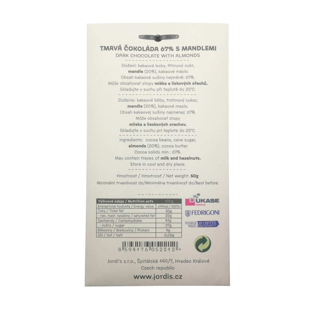 Složení: kakaové boby, třtinový cukr, kakaové máslo, mandle. Obsah kakaové sušiny nejméně 67 %.